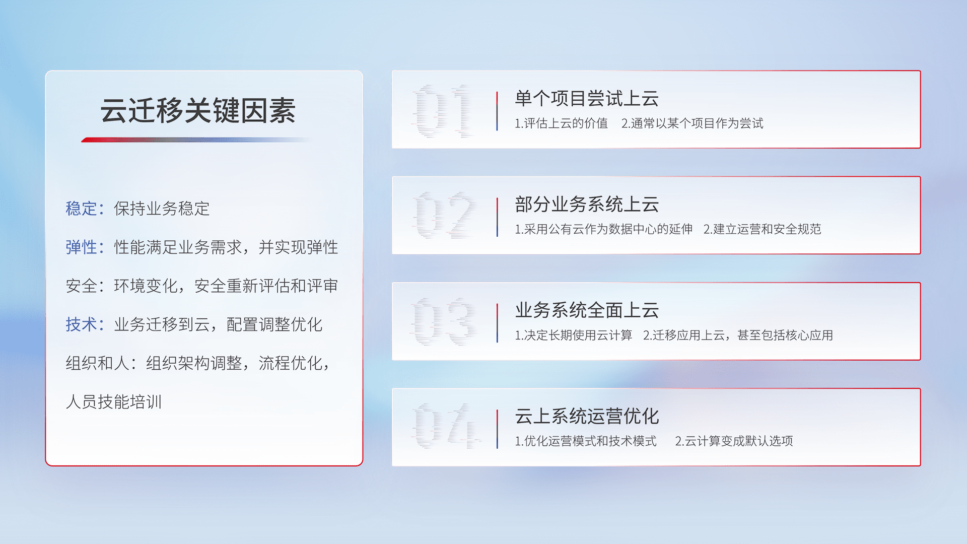 结合实际业务,,,从规划设计、、、、云平台选型、、、云原生改造、、、、数据迁移、、集成交付,,,,迁移全过程为客户识别最佳上云路径,,,,做好风险识别管理,,,设计网络架构、、、、身份权限、、、安全审计合规、、、操作审计、、、、日志审计、、、、监控告警策略、、多站点容灾设计等,,,对云上基础设施进行整体规划,,提升IT治理水平,,,以满足弹性、、高可用、、、、高性能的需求。。